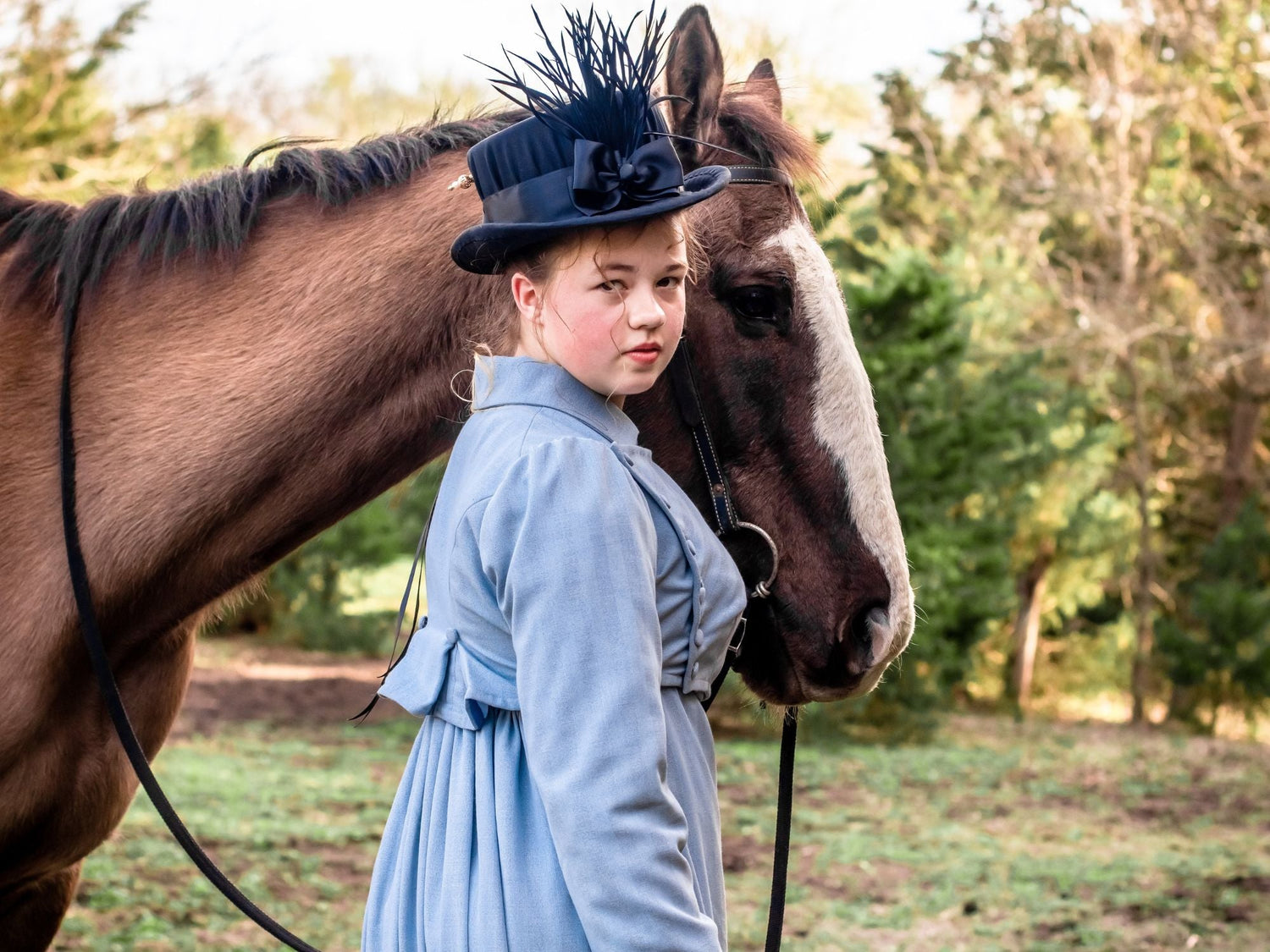 Inspired by this equestrian journey to the Bingley's, Jane's Riding Habit is a dress I have dreamed of making for a long time. This design is based on extant examples of riding habits and made in a lightweight wool. Made of two pieces, it can mix-and-match with other items in your Regency wardrobe to create greater variety, as well.