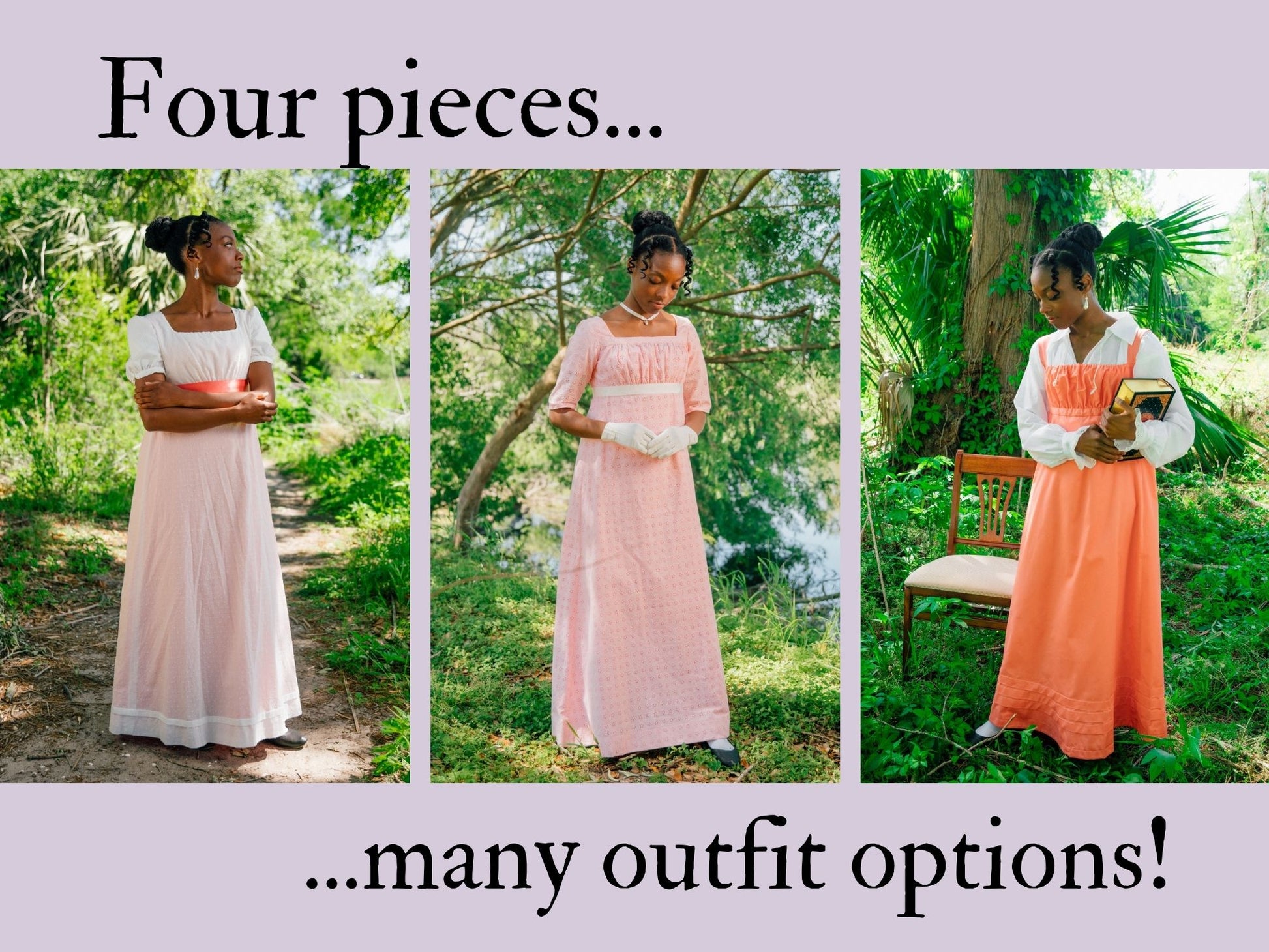 Before the age of fast fashion, Regency women had a limited wardrobe. They would combine the pieces they had in various ways before eventually remaking them into the latest fashions. This fact inspired Miss Lambe's Wardrobe, a Regency-era capsule wardrobe consisting of four color-coordinating pieces: a colorful petticoat, a white habit shirt, a sheer white evening gown, and a patterned day dress. Each piece is based on extant gowns and fashion plates. When you buy the entire wardrobe, instead of buying each piece individually, you receive a 10% discount!
