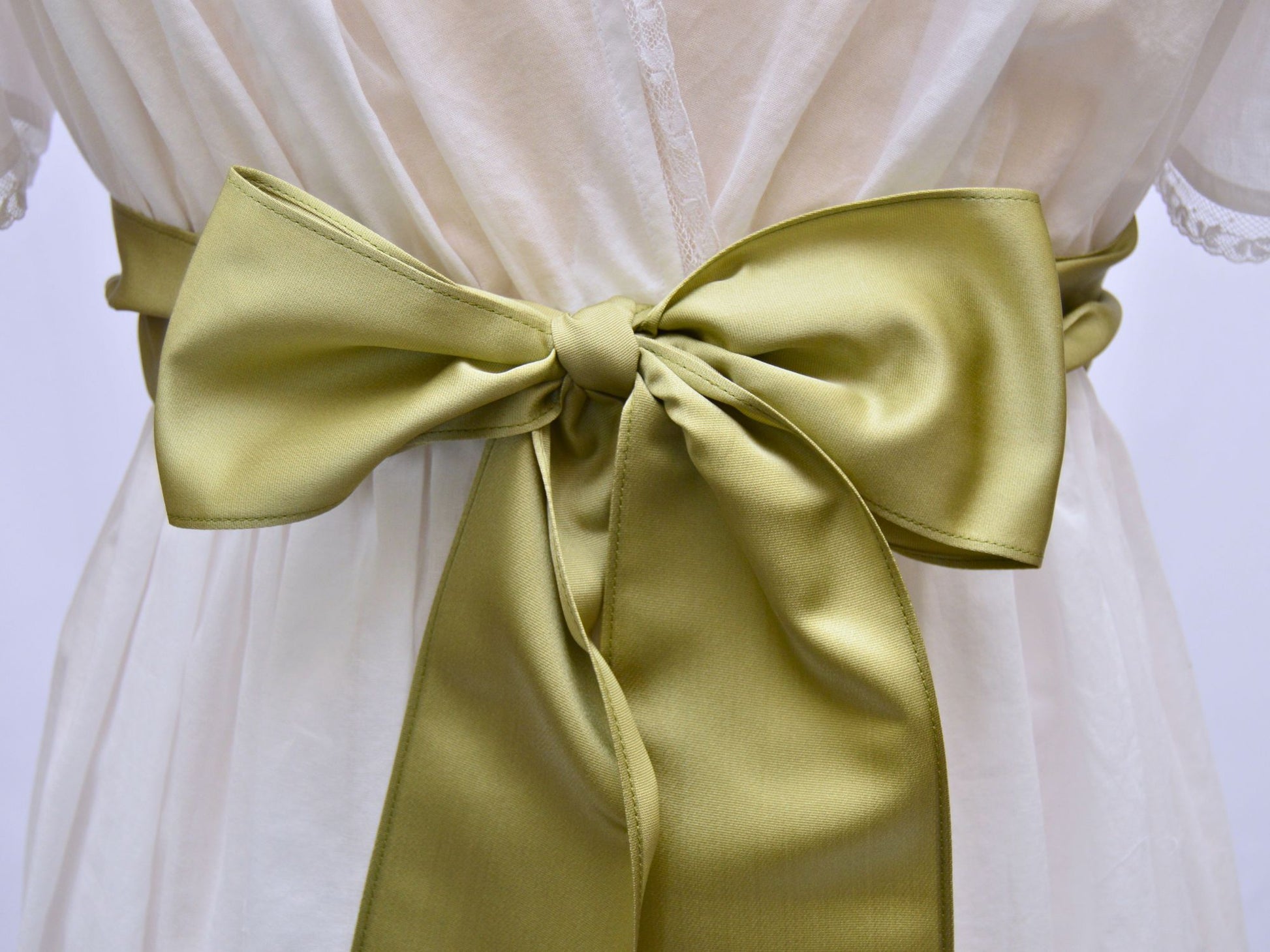 Each sash is about 3" wide and is made of either silk or cotton fabric, narrowly hemmed with a machine stitch. The generous length allows for generous tails after the ribbon has been tied in a bow.